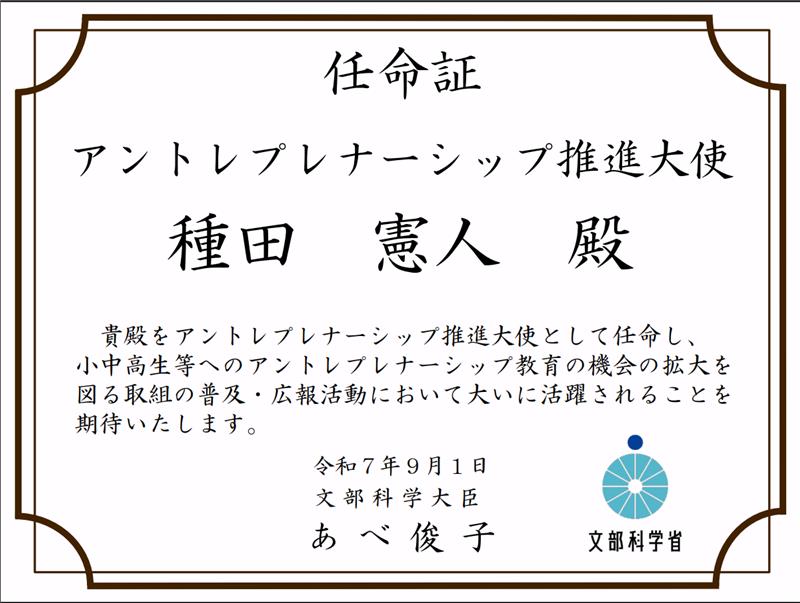 文部科学省「アントレプレナーシップ推進大使」に任命されました。